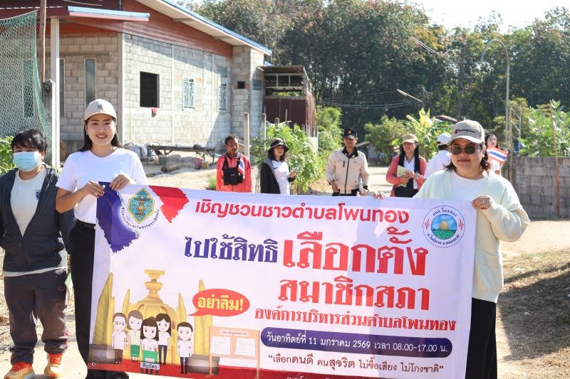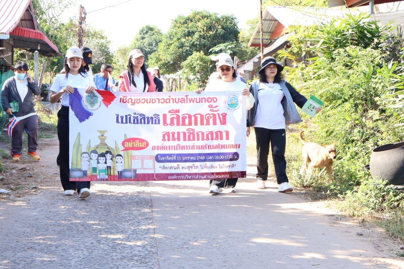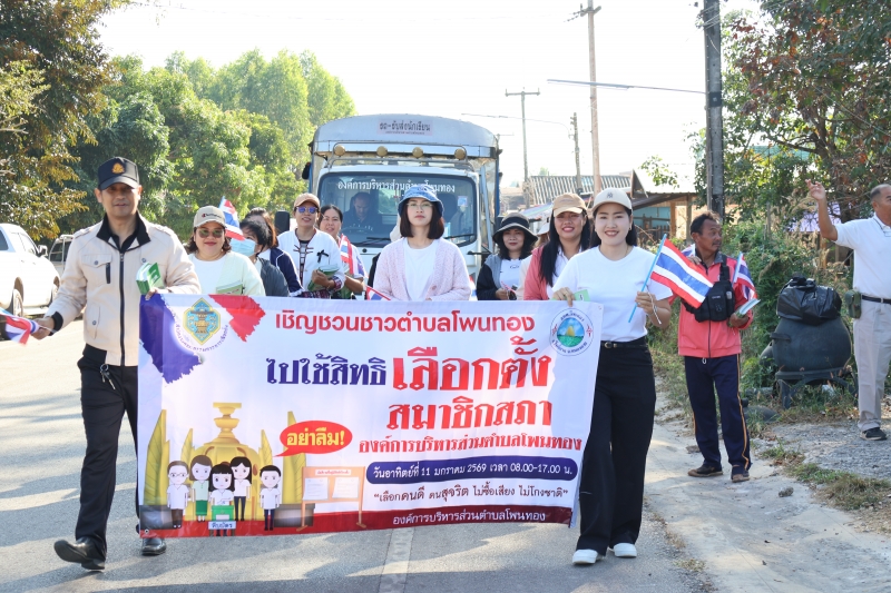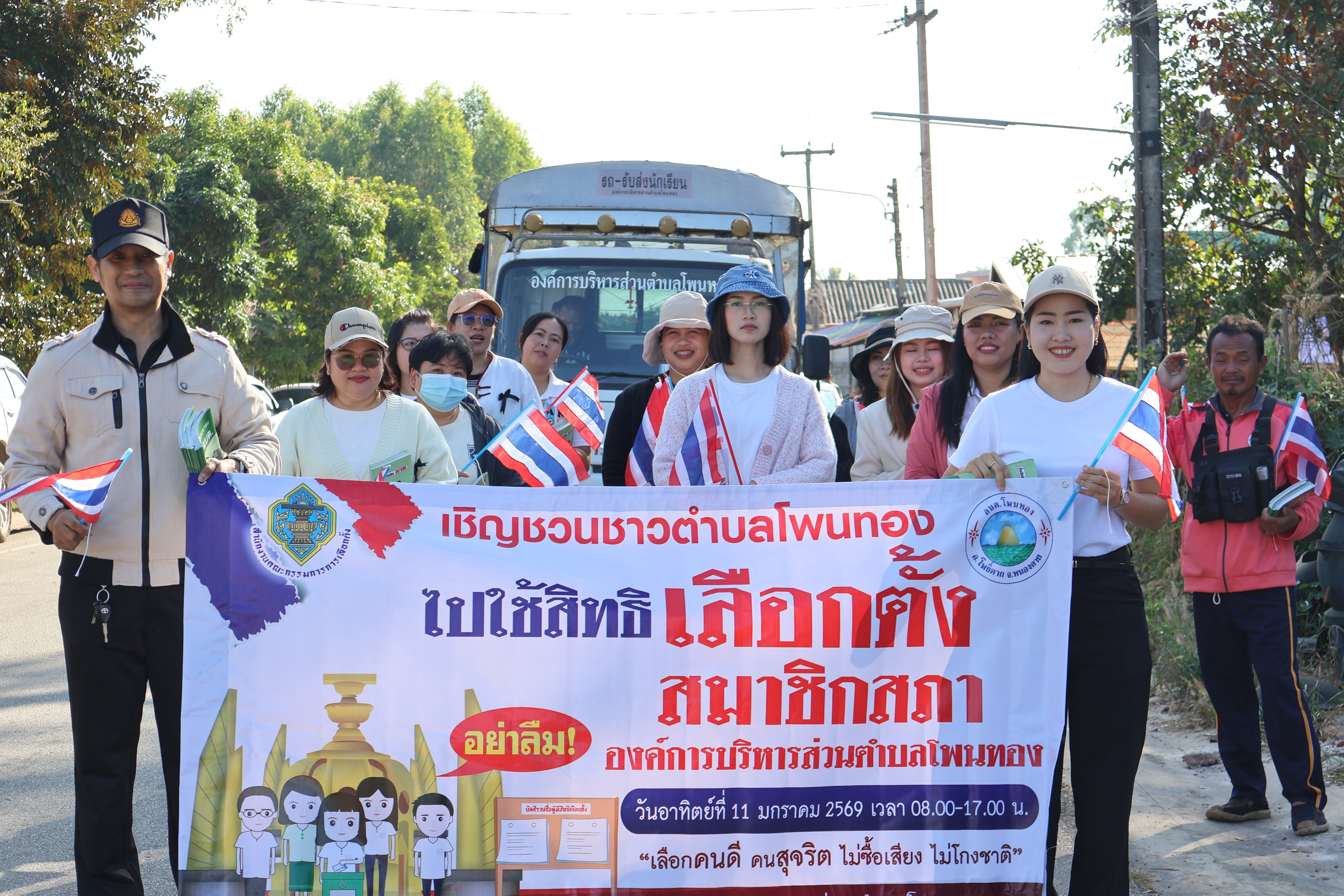 วันที่ 6 ธ.ค. 2569 เวลา 09.00 น.องค์การบริหารส่วนตำบลโพนทอง นำโดยมีนายยศสวิน อมราพิทักษ์ หัวหน้าฝ่ายสวัสดิการสังคม ร่วมกับ เจ้าหน้าที่ พนักงาน อบต. ได้จัดกิจกรรมเดินรณรงค์เชิญชวนประชาชนให้ไปใช้สิทธิเลือกตั้งสมาชิกสภาองค์การบริหารส่วนตำบล มีการถือป้ายรณรงค์ และมอบคู่มือประชาชนเลือกตั้ง อบต. ให้ความรู้ให้กับประชาชน 11 หมู่บ้าน ในพื้นที่เขตตำบลโพนทอง เพื่อเชิญชวนประชาชนออกมาใช้สิทธิ์เลือกตั้งให้ได้มากที่สุดสำหรับการจัดกิจกรรมเดินรณรงค์ เชิญชวนประชาชนไปใช้สิทธิเลือกตั้งสมาชิกสภาองค์การบริหารส่วนตำบลในครั้งนี้ โดยมีวัตถุประสงค์ เพื่อสร้างความรู้ความเข้าใจ และเผยแพร่ข้อมูลเกี่ยวกับการ เลือกตั้ง เป็นการกระตุ้นเตือน และ สร้างความเข้าใจในสิทธิและหน้าที่ของตนในระบอบประชาธิปไตย อีกทั้งยังเชิญชวนให้ประชาชนใช้สิทธิ์เลือกตั้งสมาชิกสภาองค์การบริหารส่วนตำบล ในวันอาทิตย์ที่ 11 มกราคม 2569 เวลา 08.00 น. – 17.00 น.